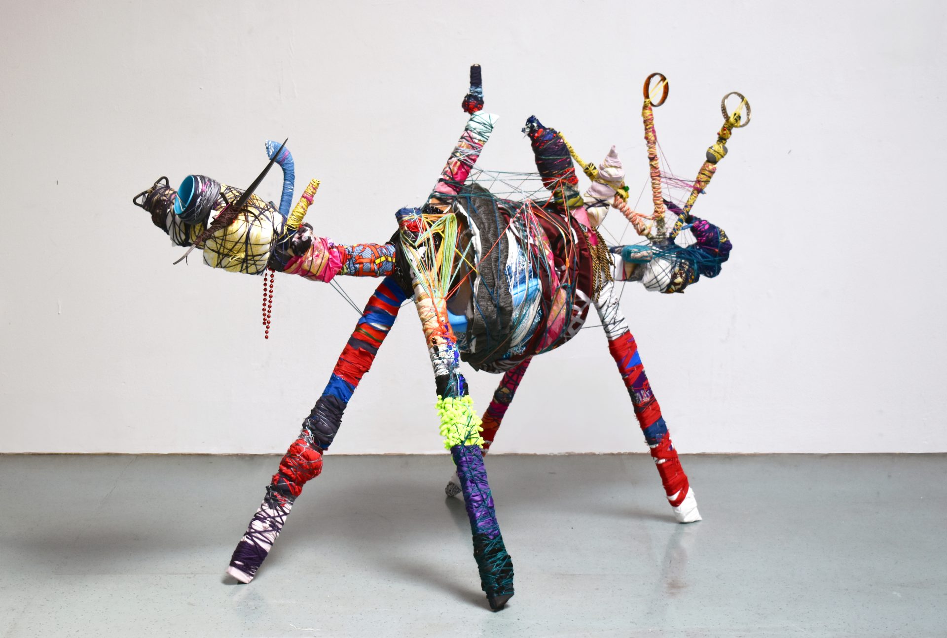 Lee Sharrock has written, “Abigail Lane is presenting an eye-catching installation and wall-mounted embroidered artwork with Suffolk gallery The Art Station. A beautifully hand-made display case holds a headless torso wearing a mustard-coloured jumper evoking the colour of rapeseed fields in the Suffolk countryside where Lane has lived since 2007. In a surreal intervention, a bird’s nest replaces the torso’s head, containing a solo egg which is reflected in a mirror above. Beneath the threadbare sweater is another case containing a picture of a bucolic waterfall, and beneath that a final cabinet containing green wellington boots with pink toes emerging.