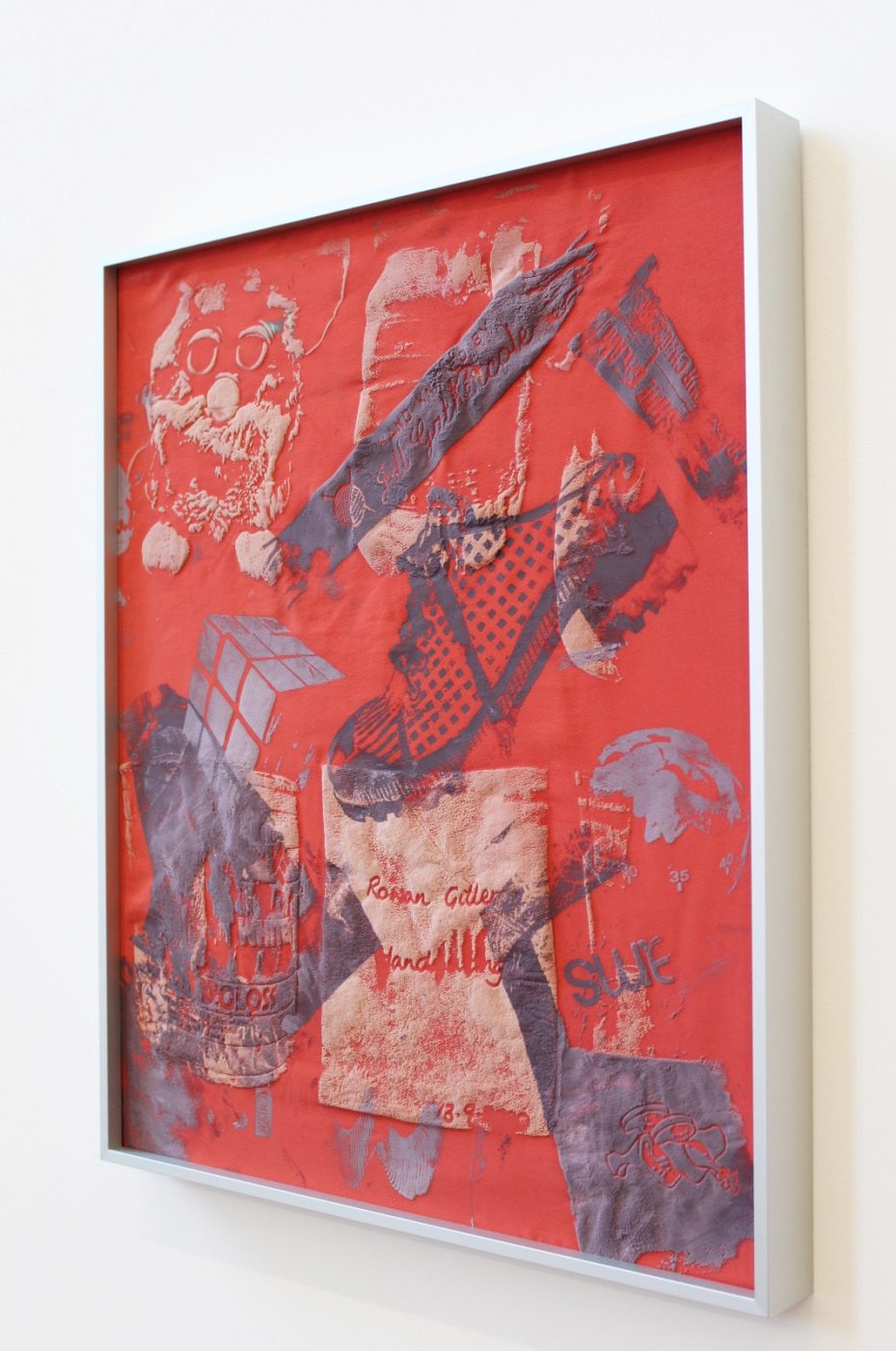 On the wall is a finely embroidered outline of a hand with thread in tones of moss green dangling down. Lane studied fine art at Goldsmiths College and her work straddles many media including printmaking, sculpture, installation and embroidery. She “embraces transformative processes which create meaning”.